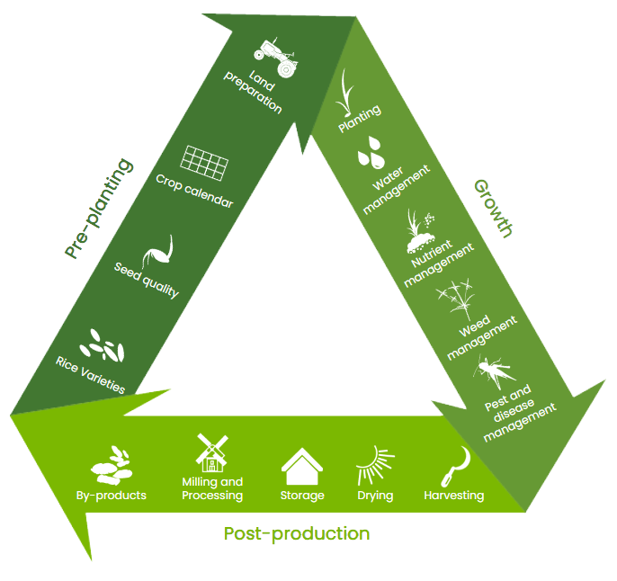 Important management factors should be considered during the growth of the rice crop. These include planting method, water, fertilizer, weeds, and pests and diseases.
